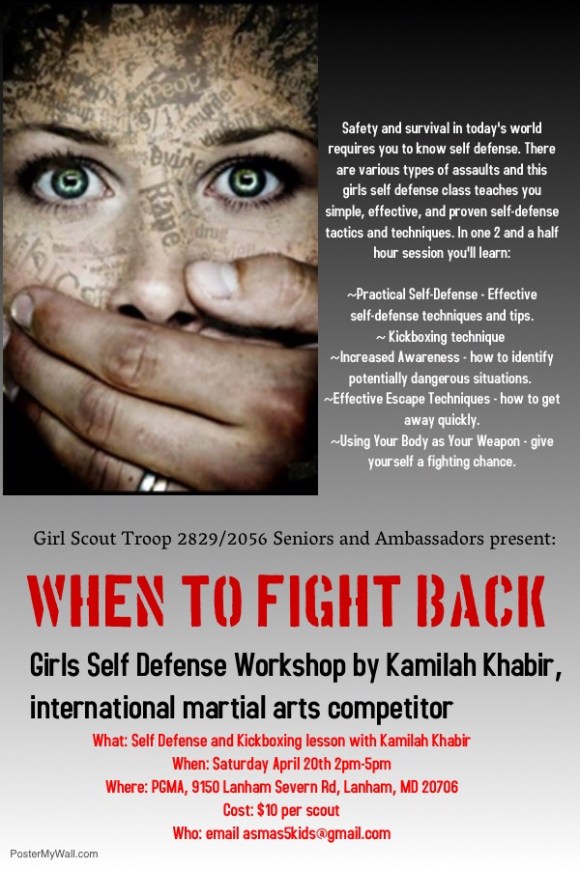 Seniors Troop 2829 and Ambassador Troop 2056 will host a Self-Defense Workshop at PGMA with Kamilah Khabir, an international martial arts competitor. This event is open to all Girl Scouts.