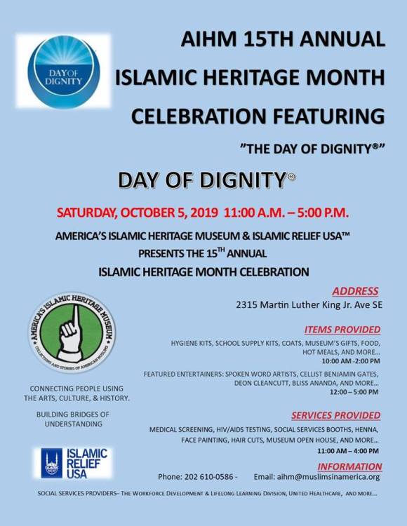 The 15th Annual Day of Dignity is a full day of serving the community with free food, basic necessities, service and fun, including free face painting, henna, hair cuts, foods, coats, entertainment, and more at America’s Islamic Heritage Museum in Southeast, Washington, D.C.